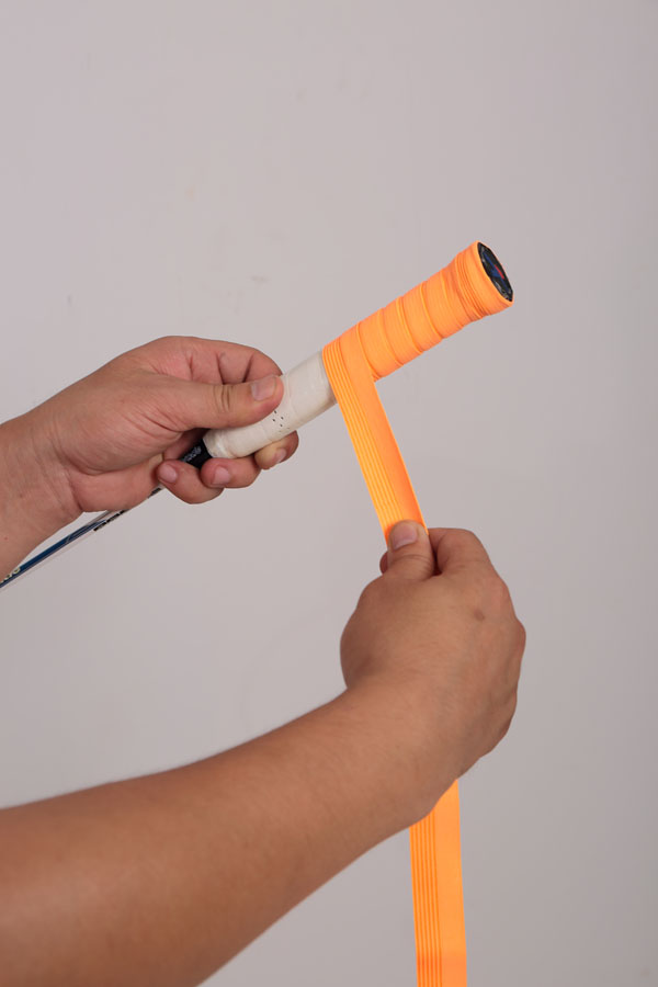 4、鑒于有雙手握拍的擊球方式,所以在纏繞吸汗帶時(shí)盡量把整個(gè)手柄覆蓋住,這樣使其才有足夠的作用空間面積給兩只手。若吸汗帶仍有多余部分可以用剪刀剪掉就可以了。